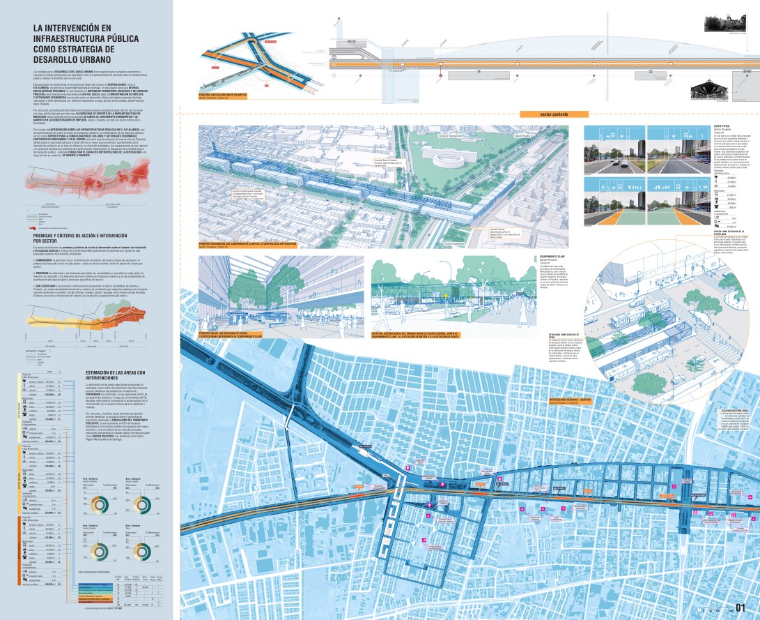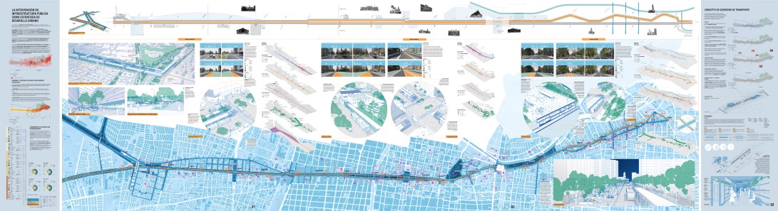 The International Competition Alameda Nueva Providência was looking for urban design and public transportation design proposals for the main axis in the city of Santiago, Chile. Our project was developed with a specific focus on mobility and also to create new public spaces, commerce, urban renewal along this axis. The complete book can be seen at this link.
