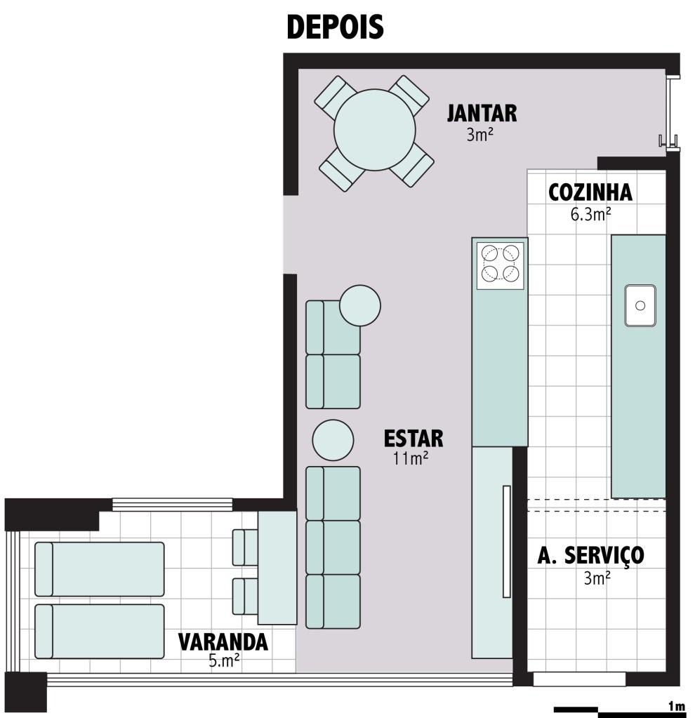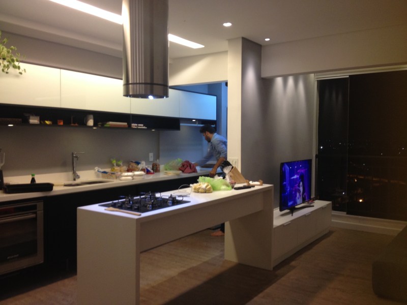 A high up apartment in the neighborhood of Ipiranga, in São Paulo. The kitchen, living room and balcony were unified in a single social space.