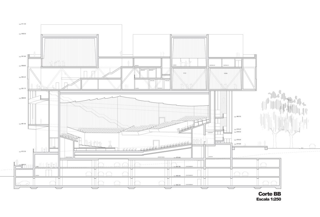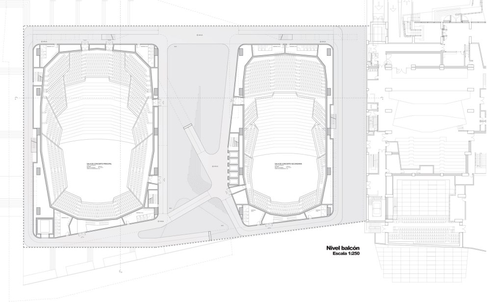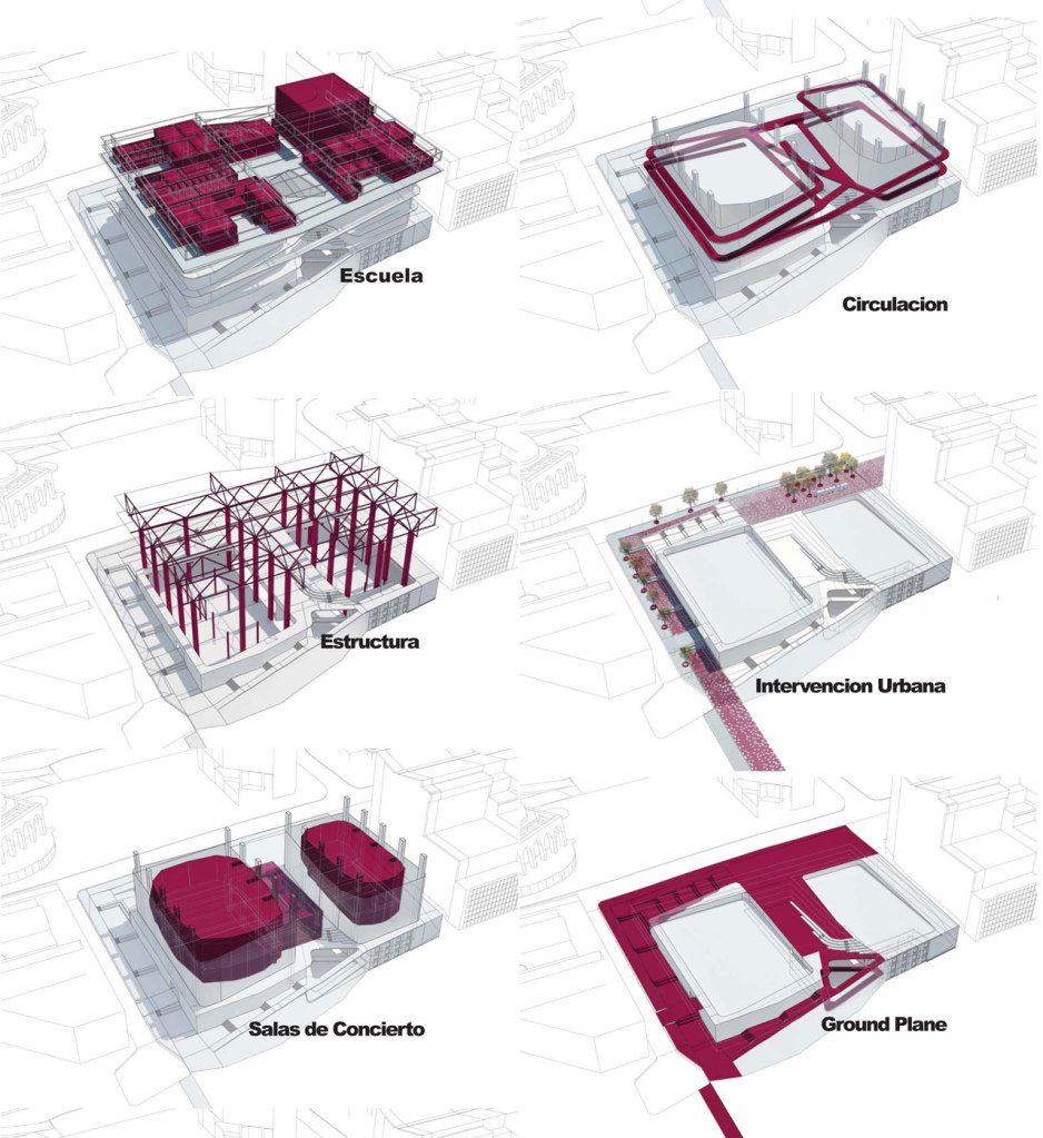 Competition done while working at Urban Think-Tank (UT-T) in Caracas, Venezuela in 2010. The goal of the project was to design a building expansion for the existing Complejo de Acción Social por la Música (CASM) located in the Venezuelan capital. The proposal developed by the UT-T team was to create a connective building able to unify its surroundings and locals through public spaces, a café and a media lab. The building also connected with the metro stop, the Los Caobos park and Amador Bendayan Boulevard. This connection was made by designing a huge open patio below the atrium formed from the distance between the two main auditorium building volumes. The classrooms were all placed on the upper floors. We were awarded Second Place.