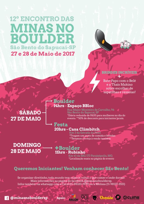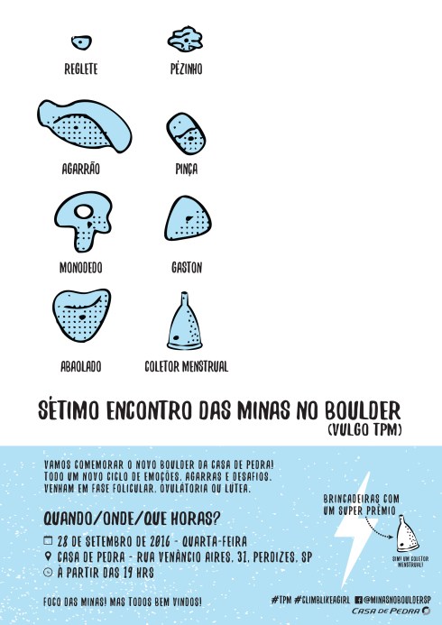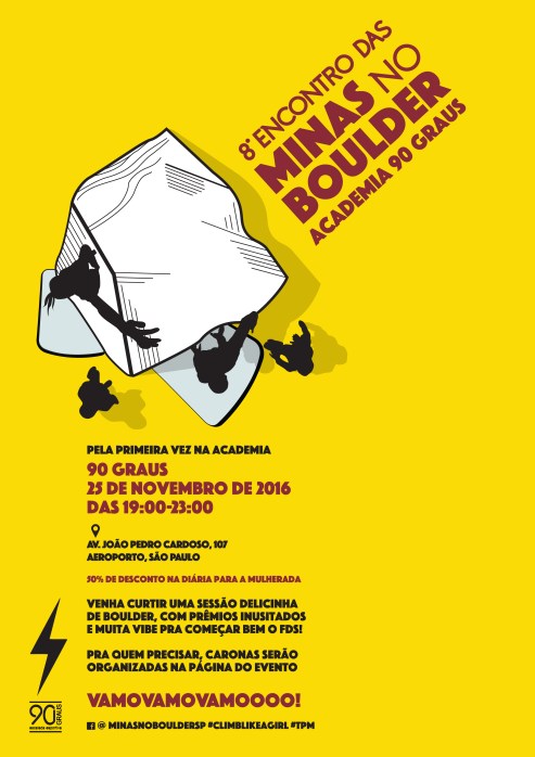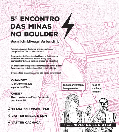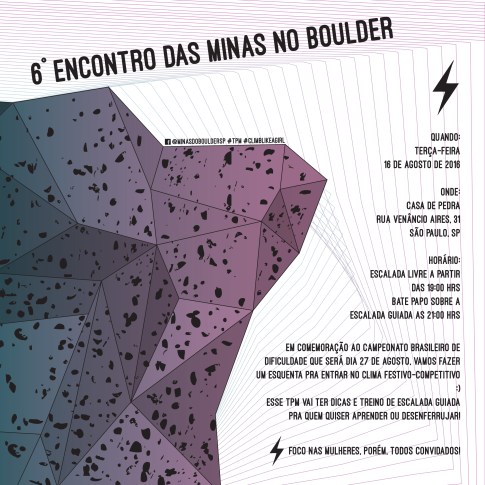 I started rock climbing early 2012 and since then I have not been able to stop. Completely in love with the sport and the community, along with a couple of friends, we founded a women’s group of climbers called Minas no Boulder (Bouldering Chicks) and since then we have been organizing monthly events, which were always announced with a poster I designed. A simple project, that started off with a few girls and today, is a well known group that helps out and welcomes girls of all climbing levels, giving them support, love and a little social fun! Below are a few of the posters.